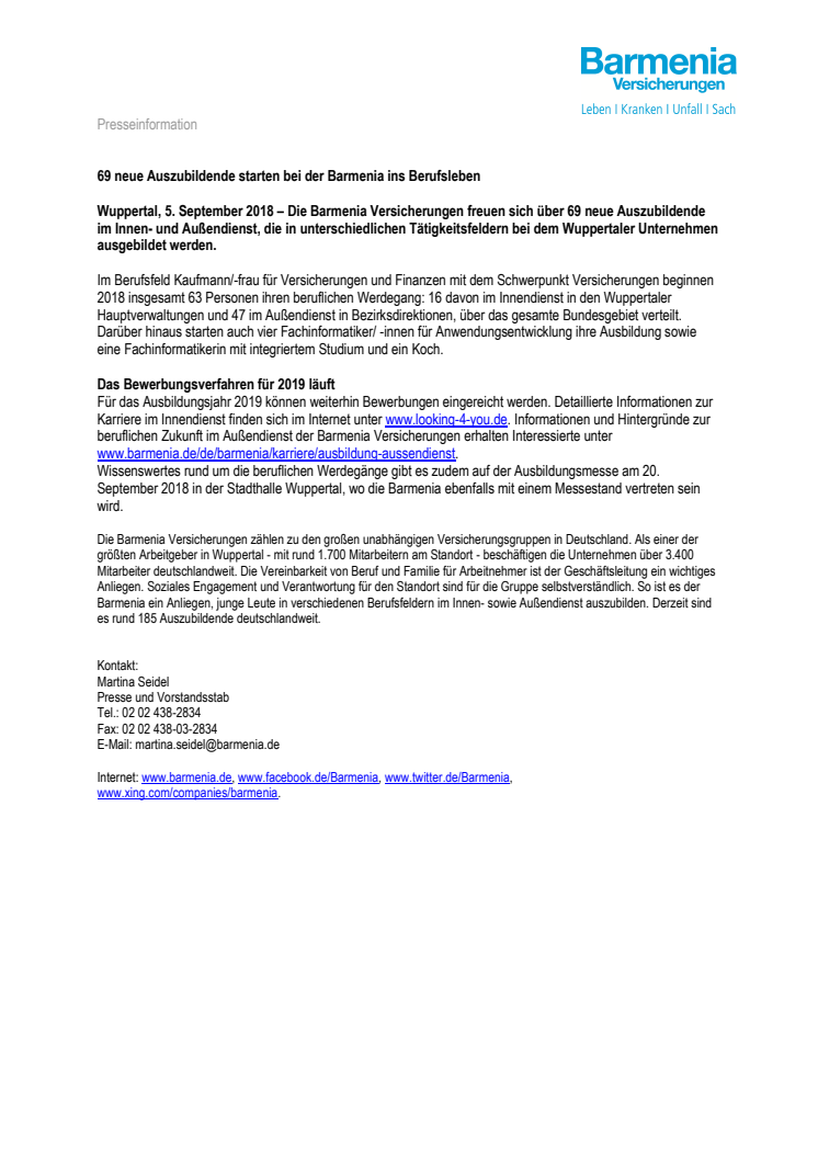 Die Barmenia Versicherungen freuen sich über 69 neue Auszubildende im Innen- und Außendienst, die in unterschiedlichen Tätigkeitsfeldern bei dem Wuppertaler Unternehmen ausgebildet werden.