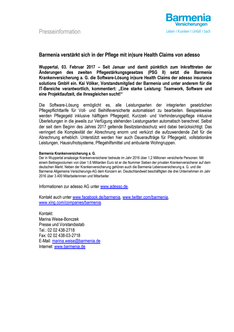 Seit Januar und damit pünktlich zum Inkrafttreten der Änderungen des zweiten Pflegestärkungsgesetzes (PSG II) setzt die Barmenia Krankenversicherung a. G. die Software-Lösung in|sure Health Claims der adesso insurance solutions GmbH ein. Dadurch verringert sich die Komplexität und verkürzen sich die Abrechnungszeiten.