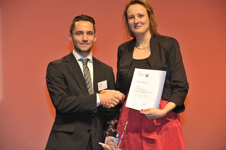 Tim Ediger wird von Christina Mersch, DIHK-Bereichsleiterin Ausbildung ausgezeichnet.