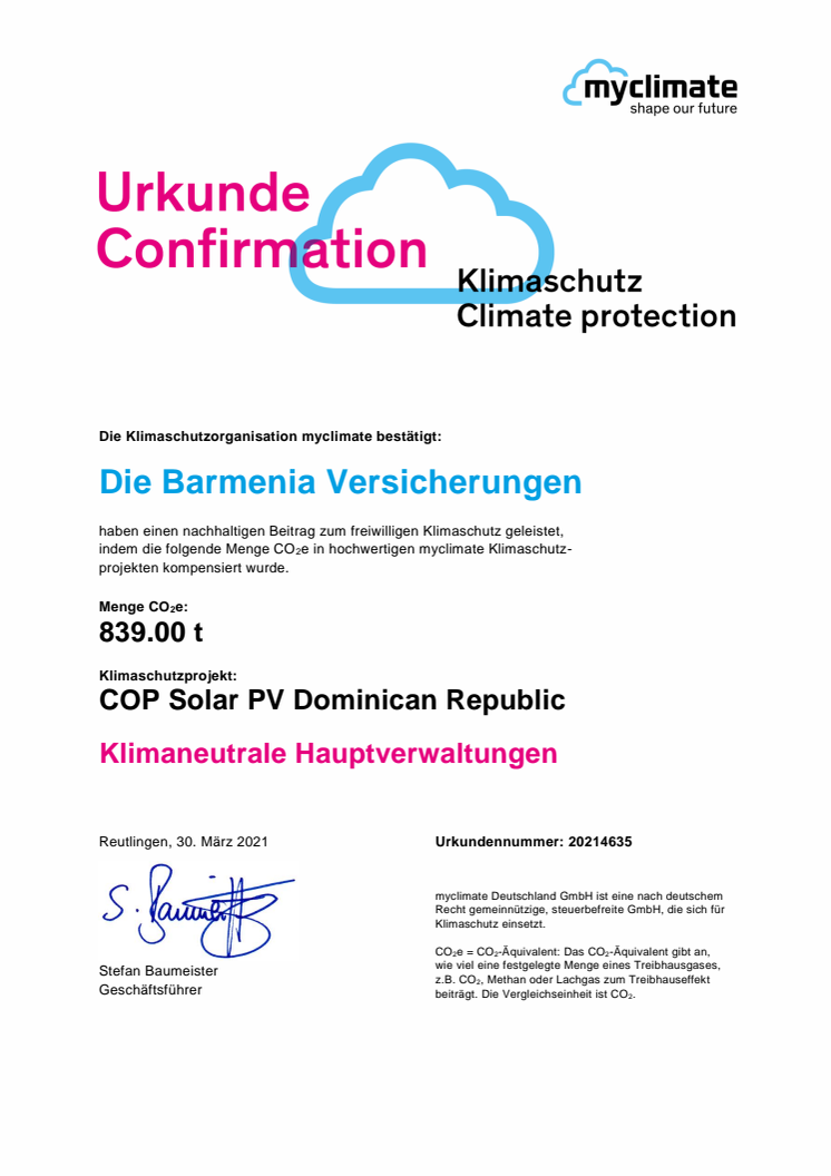 Für das Jahr 2020 gleicht die Barmenia 839 Tonnen (t) unvermeidbarer CO2-Emissionen über das Klimaschutzprojekt "Solarkraftwerk ersetzt fossile Energie“ in der Dominikanischen Republik des Partners myclimate Deutschland aus.