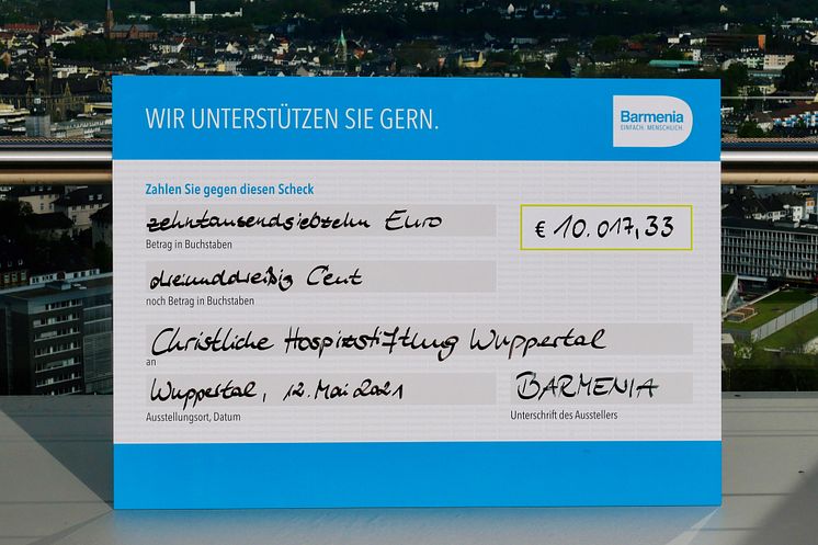 Heute übergab der Vorstandsvorsitzende der Barmenia Versicherungen, Dr. Andreas Eurich, stellvertretend für alle Barmenianer*innen eine Spende in Höhe von 10.017,33 Euro an die Christliche Hospiz-Stiftung Wuppertal. Der symbolisch überreichte Scheck wurde durch Susanne Bossy, Vorstandsvorsitzende der Stiftung und Jennifer Thielen, Leiterin des stationären Hospizes in Dönberg, entgegengenommen. Insgesamt 905 Mitarbeiterinnen und Mitarbeiter der Barmenia im Innen- und Außendienst haben sich an der Rest-Cent-Spende beteiligt und ein Jahr auf ihre Netto-Cent-Beträge hinter dem Komma der monatlichen Gehaltsabrechnung verzichtet. Die einbehaltenen Cent-Beträge in Höhe von 5.017,33 Euro wurden zum Ende des Jahres um eine Unternehmensspende in Höhe von 5.000,00 erhöht.