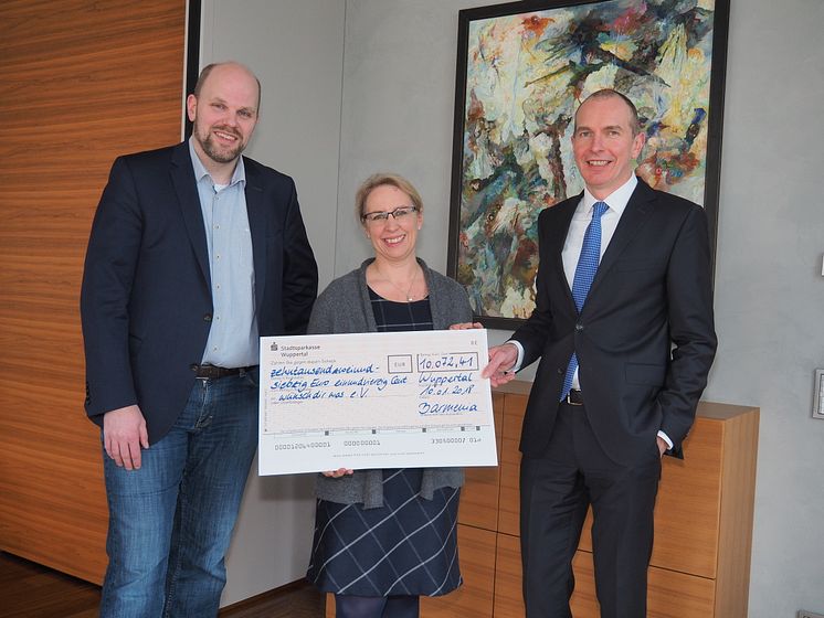Wuppertal, 11. Januar 2018 – Gestern übergab der Vorstandsvorsitzende der Barmenia Versicherungen, Dr. Andreas Eurich, gemeinsam mit Initiator Stefan Kappel stellvertretend für alle Barmenianer eine Spende in Höhe von 10.072,41 Euro an wünschdirwas e.V. Der symbolisch überreichte Scheck wurde durch Claudia Weiler, Vorstandsvorsitzende von wünschdirwas e. V., entgegengenommen. Insgesamt 890 Mitarbeiterinnen und Mitarbeiter der Barmenia im Innen- und Außendienst haben sich an der Rest-Cent-Spende beteiligt und ein Jahr auf ihre Netto-Cent-Beträge hinter dem Komma der monatlichen Gehaltsabrechnung verzichtet. Die einbehaltenen Cent-Beträge in Höhe von 5.072,41 Euro wurden zum Ende des Jahres um eine Unternehmensspende in Höhe von 5.000,00 erhöht.