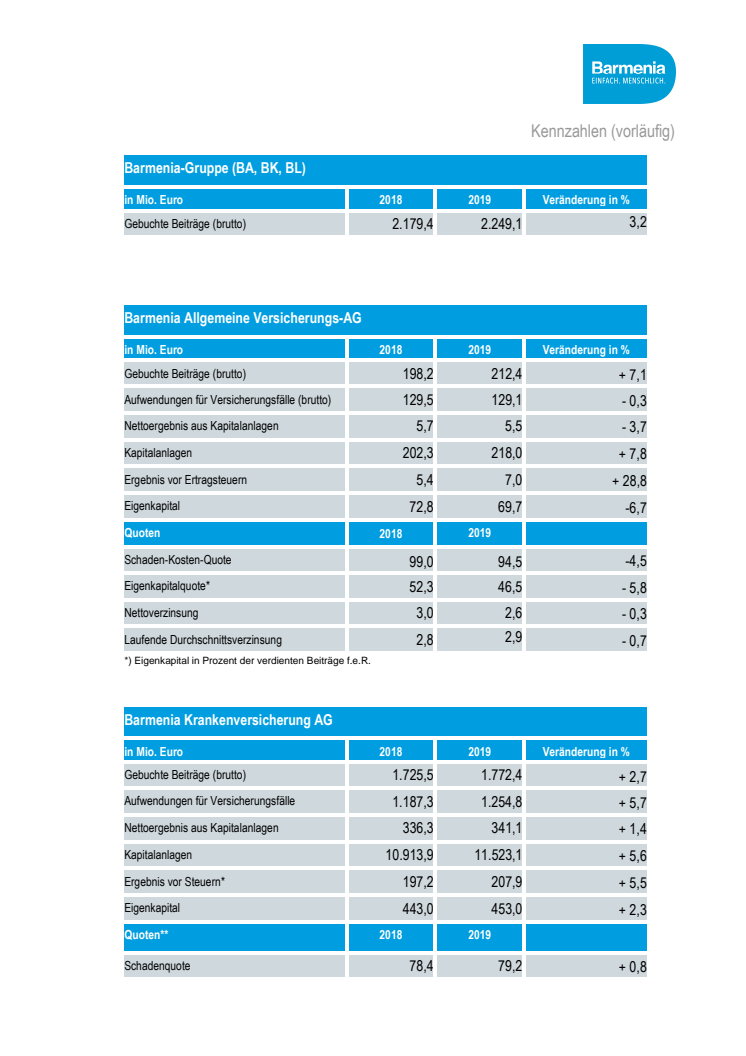 Blick auf das Geschäftsjahr 2019: Barmenia Allgemeine mit marktüberdurchschnittlicher Entwicklung - Barmenia Kranken schafft Trendwende in der Vollversicherung - Barmenia Leben mit starkem Wachstum - Gruppenstruktur optimiert